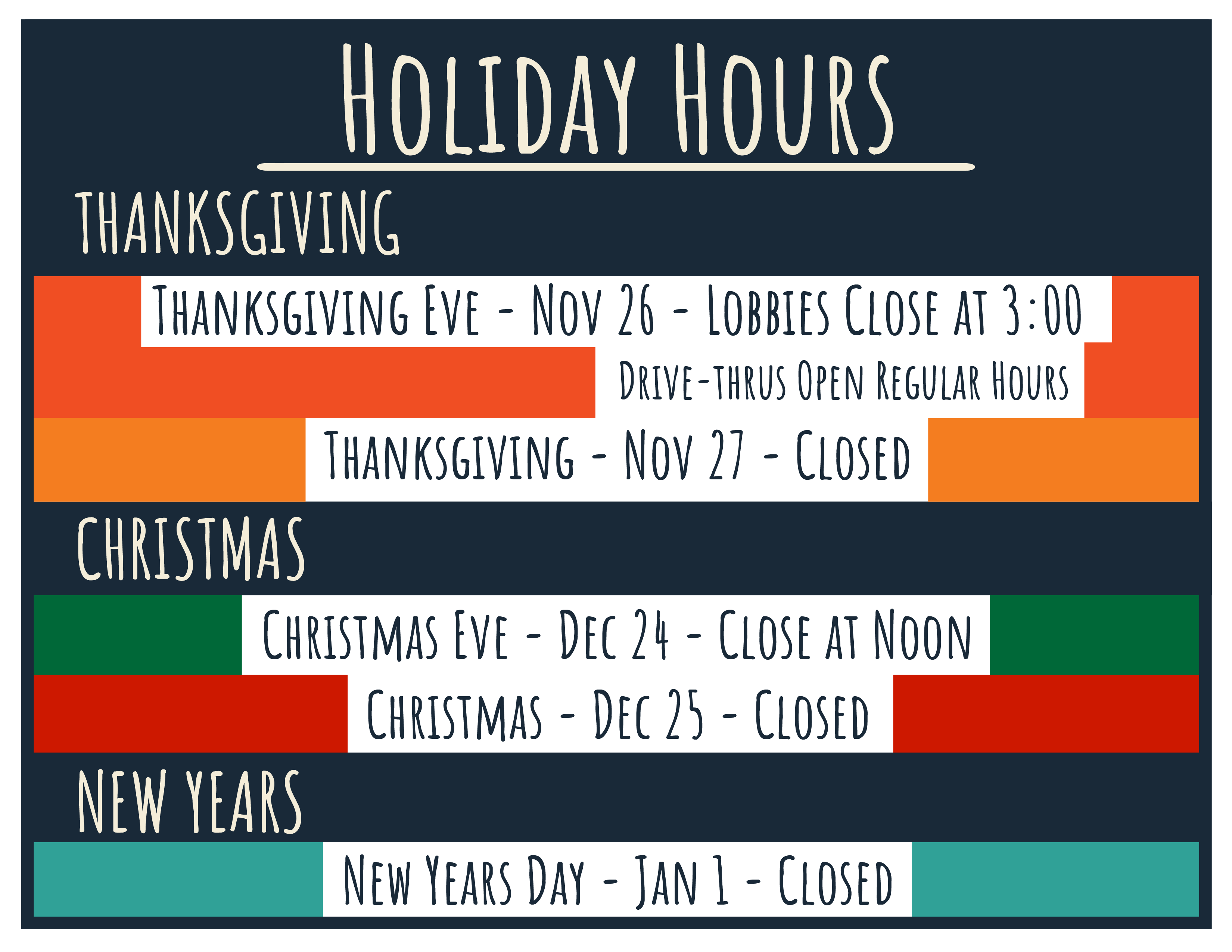 Thanksgiving Eve - Lobbies close at 3:00, Drive-thrus open regular hours